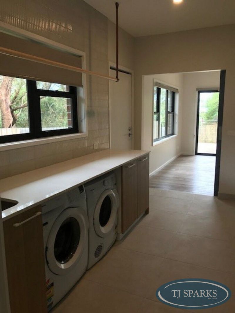 The central kitchen is a culinary enthusiast's dream, beautifully designed with high-quality timber finishes. It's well-appointed with top-of-the-line Brand new Smeg stainless steel appliances, including a modern oven, griller, rangehood and dishwasher. The ample storage space ensures you'll have room for all your kitchen gadgets and groceries. The kitchen seamlessly connects to the formal dining and living room, creating an open and spacious area for both everyday meals and special occasions. Two sets of large french doors provide views of the newly established gardens, offering a tranquil backdrop for your dining experiences. The well appointed laundry comes with brand new Simpson washing machine and dryer with ample cupboard storage and airing rack.