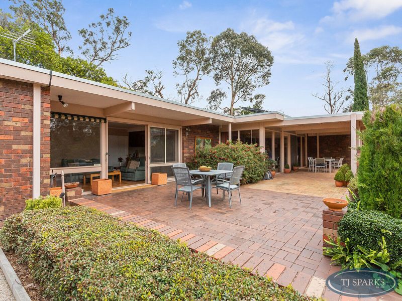 Set on more than 2600m2 (approx.) among the prestigious homes of Mt Eliza's leafy Woodland, the four-bedroom home offers mid-century modern style that has made an en trend return with exposed Hawthorn brick, cedar feature walls and grand plate glass windows.